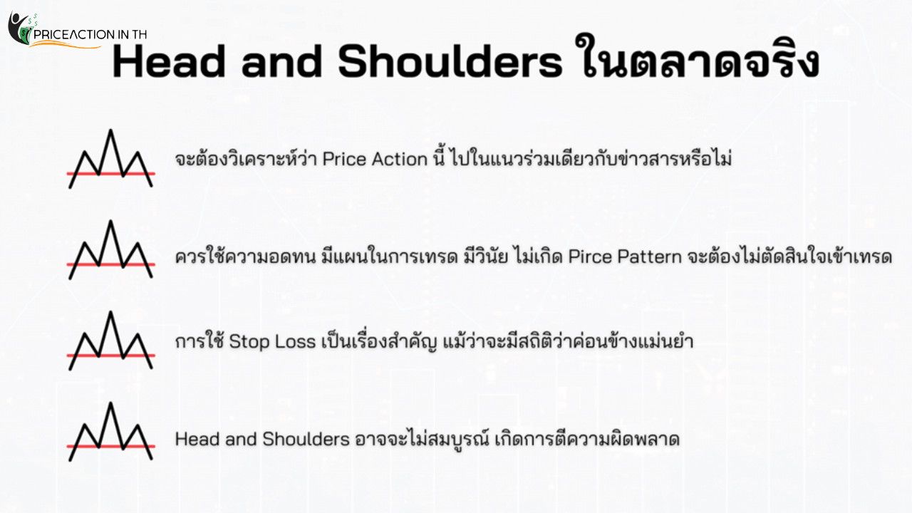 - ข้อควรระวังในหลาย ๆ ด้านของ Head and Shoulders อาจจะไม่สมบูรณ์ หรือ มีการตีความที่ผิดพลาด ทำให้ไม่เป็นไปตามแนวโน้มได้