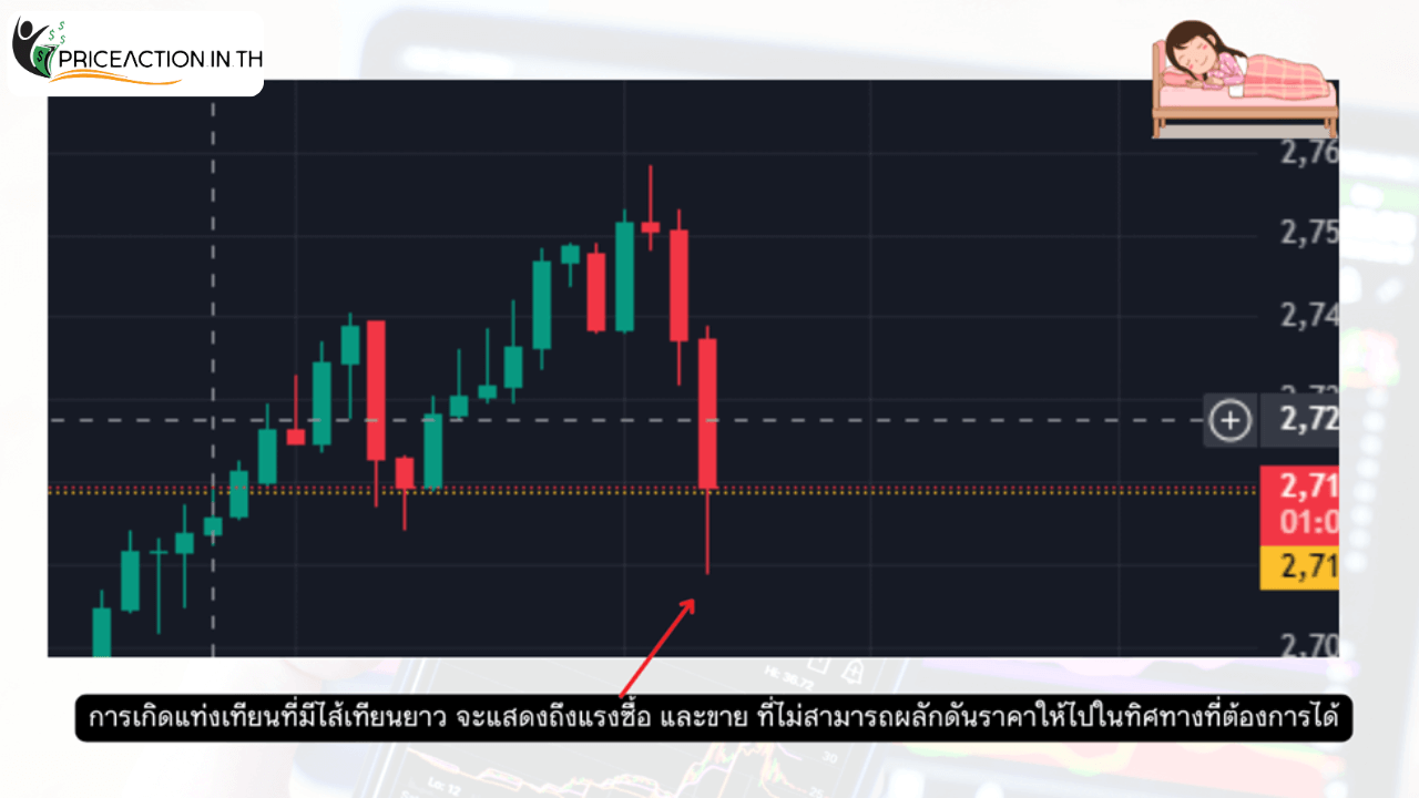 • การเกิดแท่งเทียนที่มีไส้เทียนยาว จะแสดงถึงแรงซื้อ และขาย ที่ไม่สามารถผลักดันราคาให้ไปในทิศทางที่ต้องการได้